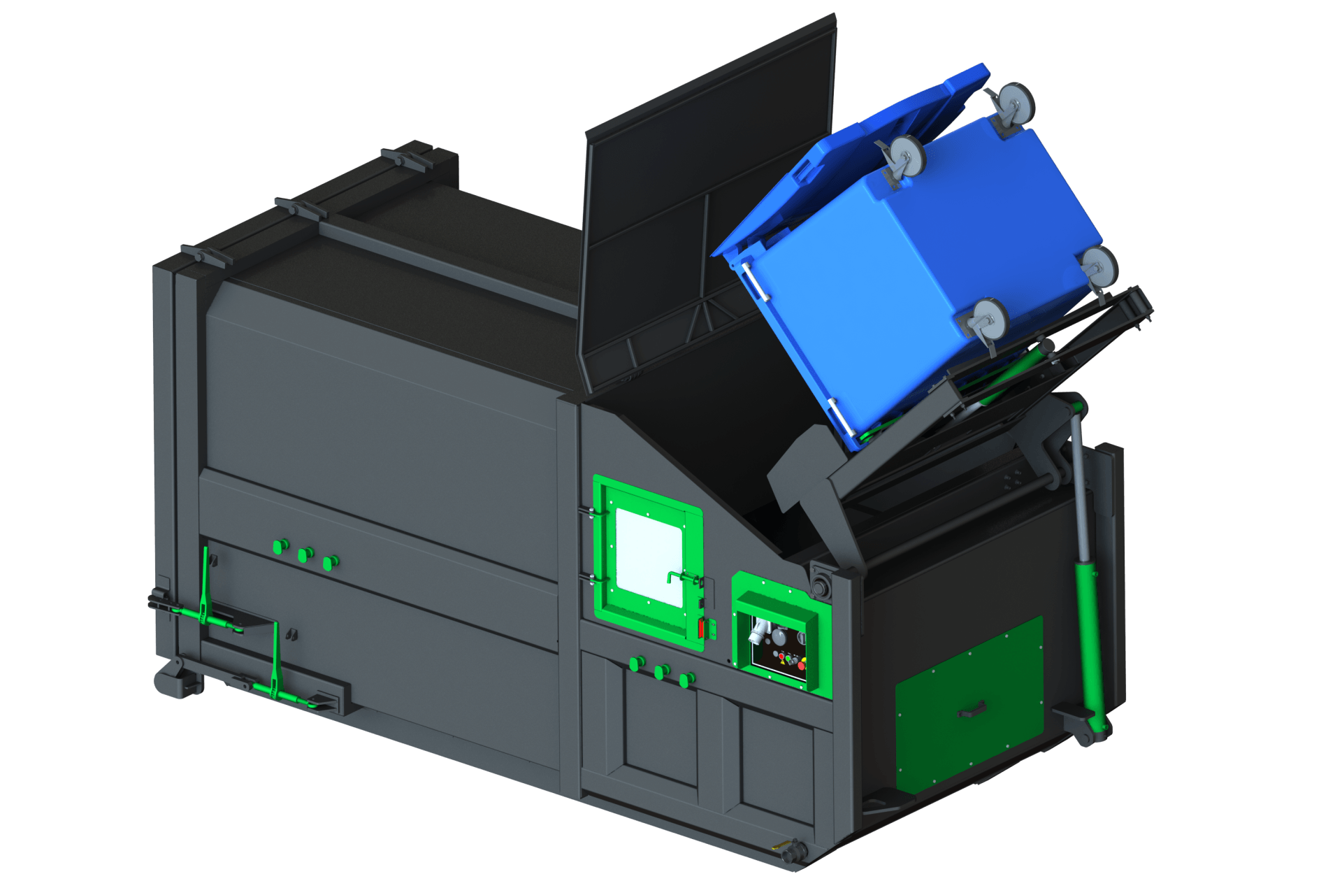 With low level access via a spring loaded, rubber sealed, lockable aluminium lid or with side safety door options it can be loaded by hand or by an automatic tipping device suitable for emptying wheeled Euro Bins.